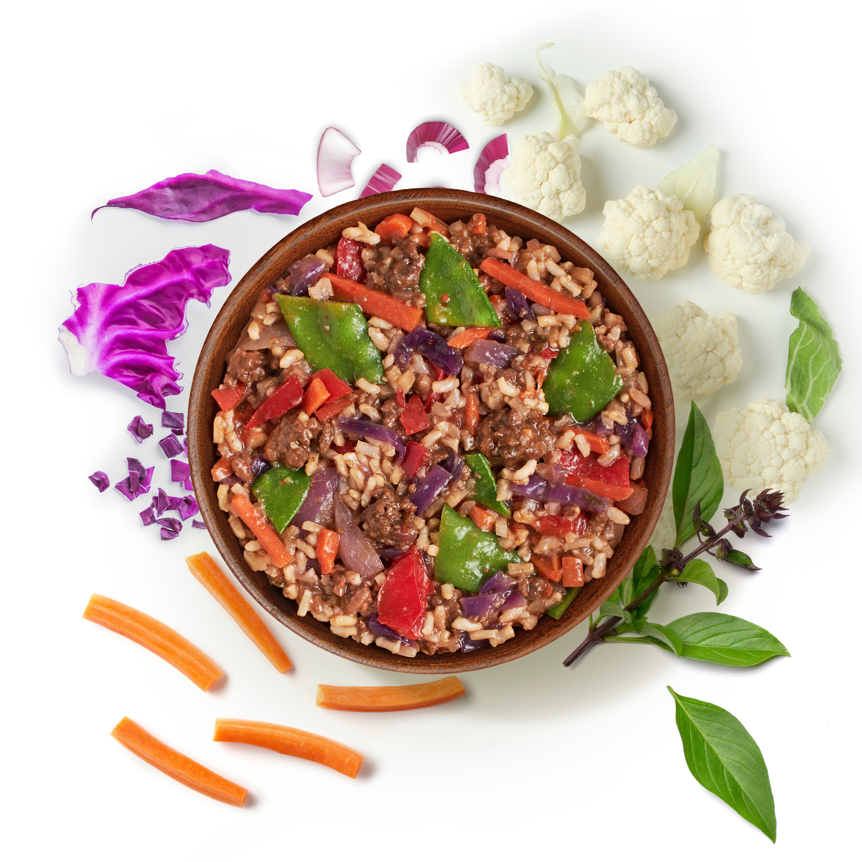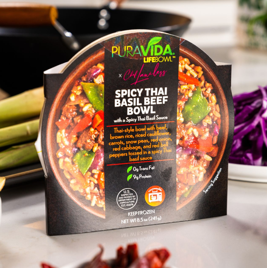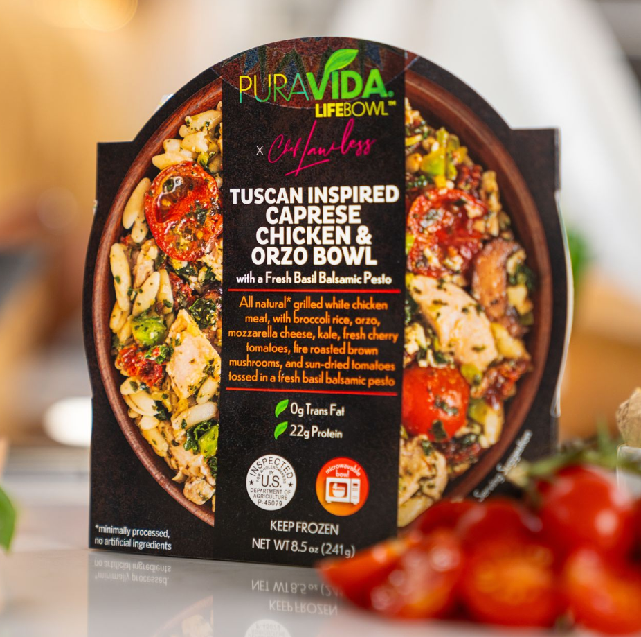 Grilled Shrimp, Cooked Brown Rice, Black Beans Red Onion, Bell Pepper, Super Sweet Corn, Mayocoba Beans, Sweet Potatoes, Extra Virgin Olive Oil, Red Wine Vinegar, Cilantro, Oregano, Sea Salt, Garlic, Spearmint, Agave (amber agave nectar), Water, Lime Juice Concentrate, Black Pepper, Himalayan Pink Salt, Red Chili Pepper Flakes, Xanthan Gum.