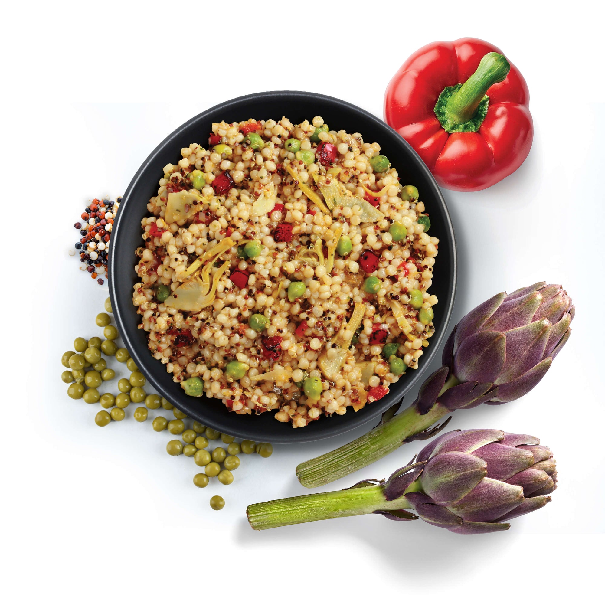 Cooked Organic Couscous, Cooked Organic Quinoa, Cooked Organic Green Garbanzo Beans, Artichokes, Bell Pepper, Organic Extra Virgin Olive Oil, Water, Red Wine Vinegar, Cilantro, Shallots, Sea Salt, Organic Garlic, Lemon Juice Concentrate, Guajillo Pepper, Ginger, Organic Red Chili Pepper Flakes, Organic Black Pepper, Paprika, Xanthan Gum, Spices.
