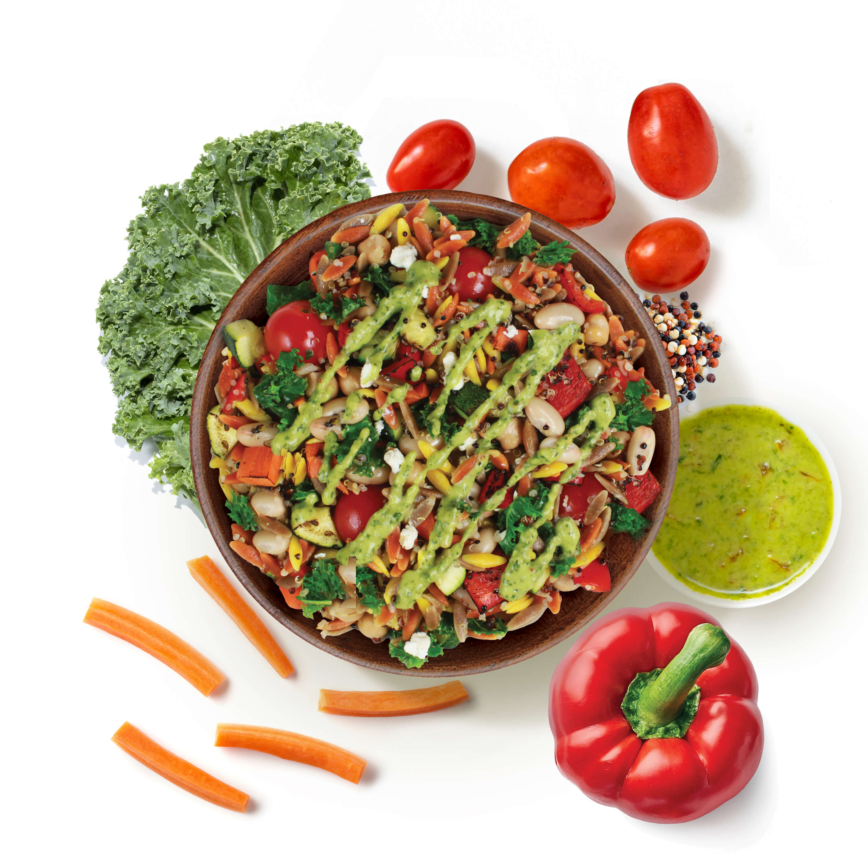 Cooked Orzo (Wheat), Chimichurri Sauce (Extra Virgin Olive Oil, Water, Red Wine Vinegar, Parsley, Shallots, Sea Salts, Garlic, Lemon Juice Concentrate, Thyme, Red Pepper Flakes, Black Pepper, Xantham Gum), Cherry Tomatoes, Zucchini, Cooked White Beans, Cooked Chickpeas, Cooked Quinoa, Carrots, Red Bell Pepper, Kale.